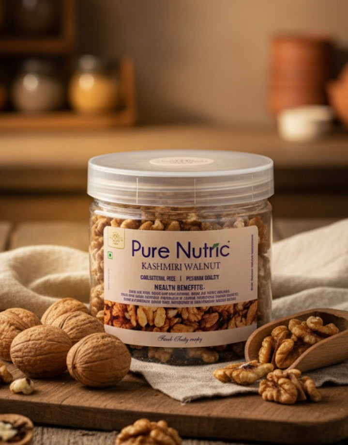 Discover the superior taste of the Himalayas with Pure Nutric Kashmiri Walnuts. Sourced from the finest orchards in Kashmir, these walnuts are prized for their light color, rich oil content, and distinctively crisp texture. We ensure every jar is packed with high-quality kernels that serve as a perfect brain-boosting snack or a nutritious addition to your morning meals.